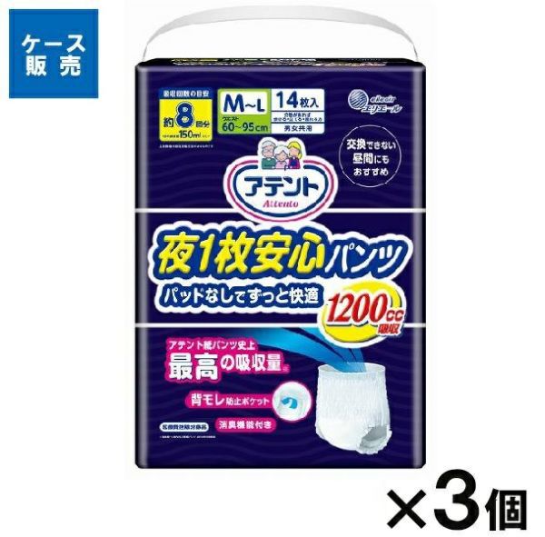 【ケース販売_3入り】アテント夜1枚安心パンツパッドなしでもずっと快適 M~L男女共用14枚