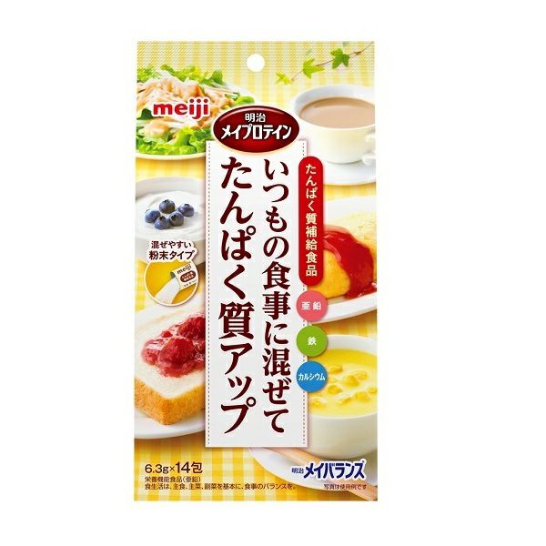 1日当たりの摂取目安量は、2包(12.6g)です。明治メイプロテイン:1包=6.3g(たんぱく質5g)
