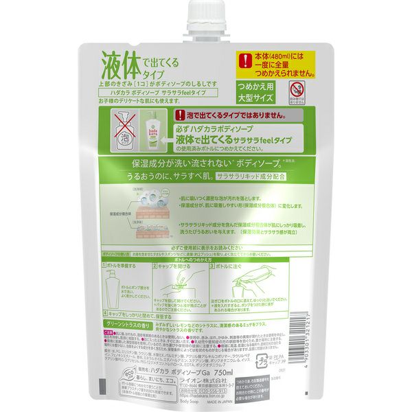 他の画像を見る hadakara (ハダカラ) ボディソープ サラサラfeel タイプ グリーンシトラスの香り 詰め替え 大型 大容量 750ml 本体価格 ¥ 658 税込 カートに入れる お気に入りに登録する