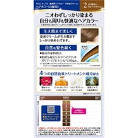 ツンとするニオイのない成分だけで作った白髪染め ニオイがない 快適な使い心地! 目や鼻にツンとくる嫌なニオイがなく、お部屋にニオイがこもらないから、快適に染められます。 ●頭皮や肌に混合クリームがついた場合、反応臭がすることがあります。 手触りアップ※ つるつるの質感に! ※当社比 髪をいたわる4つのトリートメント成分配合 椿オイル:つややか成分 ローヤルゼリーエキス:うるおい成分 高分子シルクプロテイン:はり・コシ成分 植物性プロテイン※1:毛髪保護成分 ※1 大豆たん白加水分解物 しっかりキレイな染め上がり 生え際・分け目もしっかり! 染料が効率よく髪の内部まで浸透するのでしっかりキレイに染まります。 放置時間:15分 残った分は、次にとっておけます。 クリームタイプだから気になる部分もしっかりきれい コームブラシで生え際・分け目もしっかり塗れます。 中味が出し切りやすいアルミチューブを採用しています。 必要な量だけムダなく使える