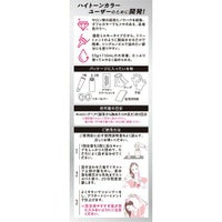 用法及び用量 【使用方法】 ●1剤全量を2剤に加えキャップをしっかりと閉めて、ただちによく混ぜ合わせてください。 ●混ぜ合わせた後すぐキャップ上部の蓋を外し、混合液を根元から毛先までたっぷりと塗り、20分程度放置します。 ●よくすすいでシャンプーをし、アフターカラートリートメントで仕上げます。 ※混合液やすすぎ湯が目に入らないようにご注意ください。 【仕上がりイメージ】 ●暗い髪に使用すると、色みは感じにくくなります。 ●ヘアカラーなどで黒く染めた髪を明るくできません。 ●ヘアカラー、ブリーチ、パーマなどの繰り返しで著しく髪が傷んでいる場合は使用しないでください。 ●本品を使用後、再度ブリーチやヘアカラーをされる場合、髪や頭皮への負担を考え、1週間以上の間隔をおいてください。 ●1箱全量でセミロング程度の髪まで染められます。 ※髪が長い方、髪の量が多い方は2箱ご用意ください。