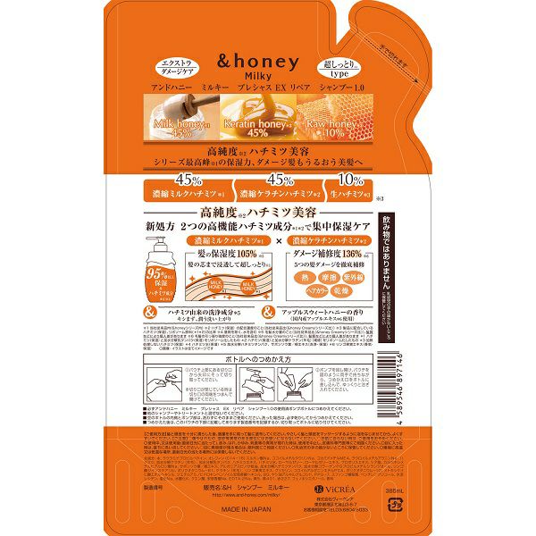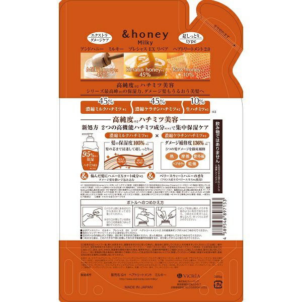 他の画像を見る アンドハニー ミルキー プレシャス EX リペア ヘアトリートメント2.0 つめかえ 385g 株式会社ヴィークレア 本体価格 ¥ 1,210 税込 カートに入れる お気に入りに登録する