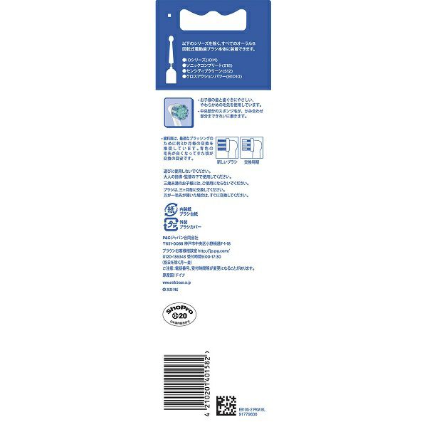 用法及び用量 【ご使用方法】 以下のシリーズを除く、すべてのオーラルB回転式電動歯ブラシ本体に装着できます。 ※iOシリーズ。(iOM) ※ソニックコンプリート。(S18) ※センシティブクリーン。(S12) ※クロスアクションパワー。(B1010) 剤型・形状 替えブラシ