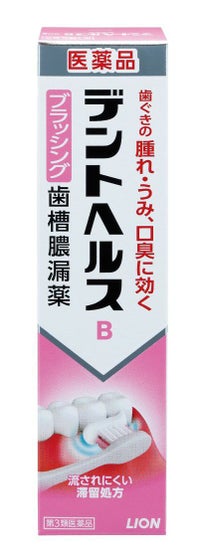 デントヘルスBは歯ぐきが腫れるなどつらい時に,歯ブラシにつけて歯ぐきをマッサージするブラッシングタイプの歯肉炎・歯槽膿漏薬です。