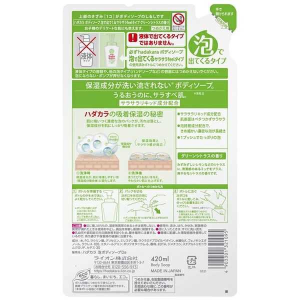 ハダカラ泡ボディソープ サラサラ グリーンシトラス 詰替