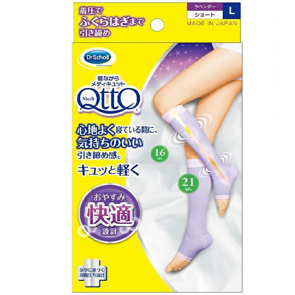 「寝ながらメディキュット ショート ラベンダー L」は、はくだけで脚をキュッとひきしめ軽くする着圧ソックスです。