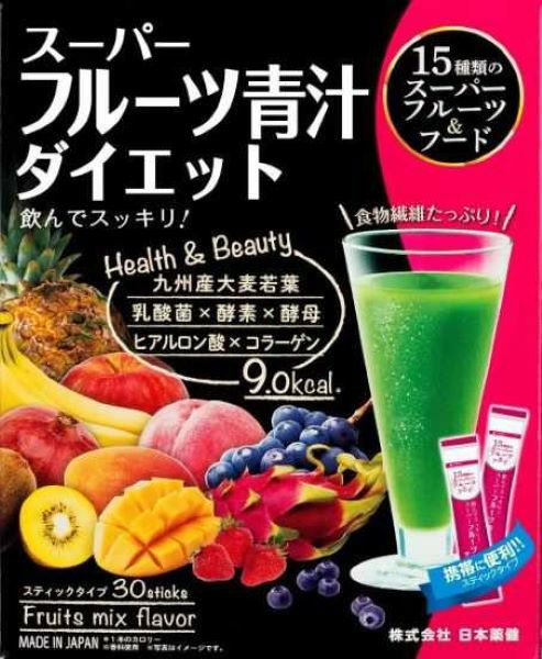 九州産大麦若葉に15種類のスーパーフルーツ&フード配合。フルーティーで甘く、飲みやすいおいしい青汁です。