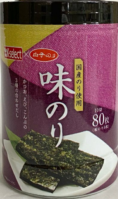 乾のり(国産)、調味液(しょうゆ、砂糖、水あめ、食塩、かつお節エキス、えびエキス、酵母エキス、こんぶエキス)/調味料(アミノ酸等)、甘味料(甘草)、香辛料(一部に小麦、えび、大豆を含む)内容量10切80枚(板のり8枚)賞味期限:枠外の右下部に記載
