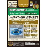 成分・分量 (100ml中) レチノールパルミチン酸エステル:50000単位 酢酸d-α-トコフェロール:0.045g ピリドキシン塩酸塩:0.01g コンドロイチン硫酸エステルナトリウム:0.1g タウリン:1g L-アスパラギン酸カリウム:0.8g ネオスチグミンメチル硫酸塩:0.005g クロルフェニラミンマレイン酸塩:0.03g 塩酸テトラヒドロゾリン:0.02g イプシロン‐アミノカプロン酸:1g ベルベリン塩化物水和物:0.015g グリチルリチン酸二カリウム:0.25g 添加物として、ホウ酸、トロメタモール、エデト酸Na、BHT、プロピレングリコール、ポビドン、ヒプロメロース、ポリオキシエチレンポリオキシプロピレングリコール、l-メントール、dl-カンフル、d-ボルネオール、pH調整剤を含む。