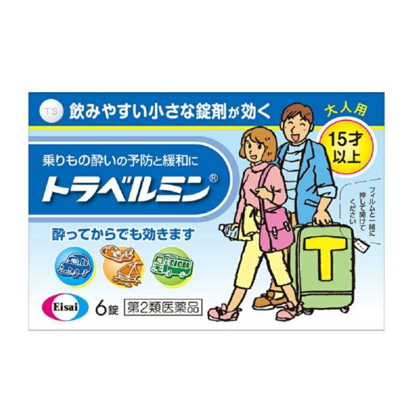 トラベルミンは、乗りもの酔い症状の予防及び緩和に有効な、大人用の乗りもの酔い薬です。酔う心配がある場合、乗る30分前の服用により、乗りもの酔い症状が予防できます。また、酔ってしまった時でも、服用によって乗りもの酔い症状である「めまい」「吐き気」「頭痛」を改善し、旅行を楽しむことができます