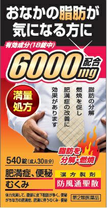 成人1日量あたりエキスを6000mgを配合した、満量処方の防風通聖散です。 たっぷりエキスがお腹まわりの余分な皮下脂肪に良く効きます。