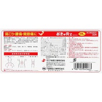 おきゅ膏Zはこれを貼りますと、配合成分が患部皮下組織に浸透し、一瞬しみとおるような感じがあります。そして、患部の毛細血管を拡張して血液の循環を高め、筋肉その他の組織に快い温感を与えて、こりや痛みを鎮めます。 症状別の貼付位置参考図 ―――肩こり――― 頸のつけ根から背側 脊柱上部の最もつき出た骨の下凹部 肩上部頸 肩甲骨の上側の骨のきわ 肩甲骨の中央部 肩甲骨の内側の骨のきわ ―――腰痛――― 第1腰椎下の左右 第2腰椎下の左右 第2腰椎下の左右 第4腰椎下の左右 ―――関節痛――― 関節の周囲 ―――筋肉痛、打撲、捻挫――― 押えて痛みのあるところ 圧痛のあるところ こたえるところ を選びます。