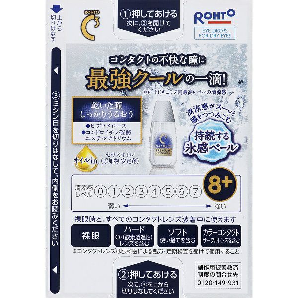 「ロートCキューブプレミアムアイススパーク」はコンタクトの不快な瞳にうるおいを与える、ロートCキューブ内最強クール*なさし心地の目薬です。 ロート独自の製剤設計で清涼感がスーッと瞳をつつみこみ、氷がベールするような点し心地を実現。 ヒプロメロース、コンドロイチン硫酸エステルナトリウム配合で乾いた瞳がしっかりうるおいます。 さらに、ロート製薬独自の滞留性設計で清涼感とうるおい感の持続を実現。 すべてのコンタクトレンズに対応。 コンタクトレンズを装着していない目にもお使いいただけます。 自然にやさしい環境に配慮したエコ包装!紙の使用量削減のため、添付文書は封入せず外箱の中面を利用して使用上の注意等を記載しています。 *ロートCキューブ内最高レベルの清涼感