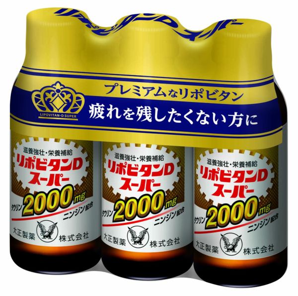●リポビタンDスーパーは、タウリン2000mgに、人参ニンジン910mg(原生薬換算)、ビタミンEなどを配合した100mLドリンク剤です。