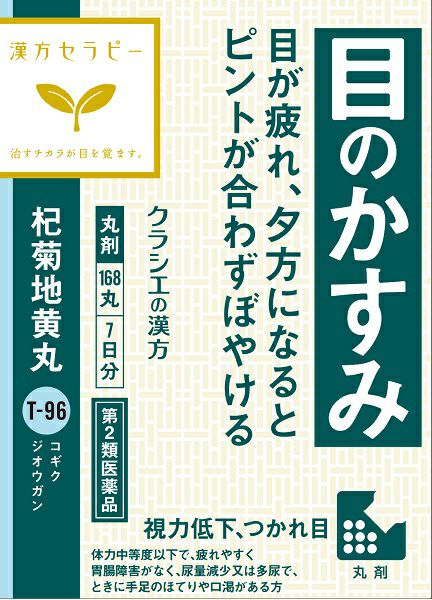 ●「杞菊地黄丸」は、「六味地黄丸」に菊花と枸杞子を加えた処方で、体力中等度以下で、疲れやすく胃腸障害がなく、尿量減少又は多尿で、ときに手足のほてりや口渇がある人のかすみ目、つかれ目、のぼせ、頭重、めまい、排尿困難、頻尿、むくみ、視力低下などに効果があります