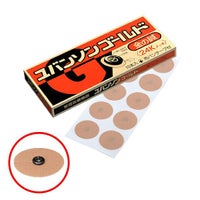 ユバンソンゴールドは、円形の酸化鉄粉末成型板に純金24Kメッキされた鍼(円皮鍼・ゴールド)を固定し、布バンテープで安定させた医療機器です。