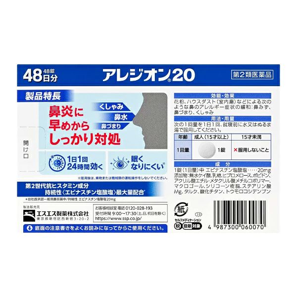 他の画像を見る 【1日あたり約155円】 【第2類医薬品】エスエス製薬 アレジオン20 48錠【セルフメディケーション税制対象商品】 セルフメディケーション税制対象 本体価格 ¥ 7,469 税込 カートに入れる お気に入りに登録する