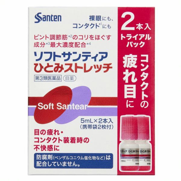 「ソフトサンティア ひとみストレッチ」は目の疲れ、コンタクト装着時の不快感を改善する 目薬で、「ソフトサンティア」と同じく防腐剤(ベンザルコニウム塩化物など)は配合して おりません。
