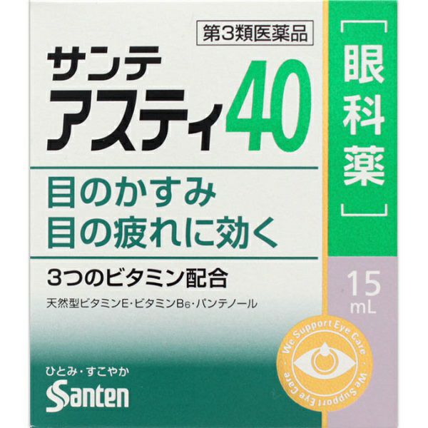 サンテアスティ40新は、目の機能を活性化する栄養成分(ビタミン・アミノ酸)など5つの成分が疲れ目やかすみ目に効果を発揮する目薬です。