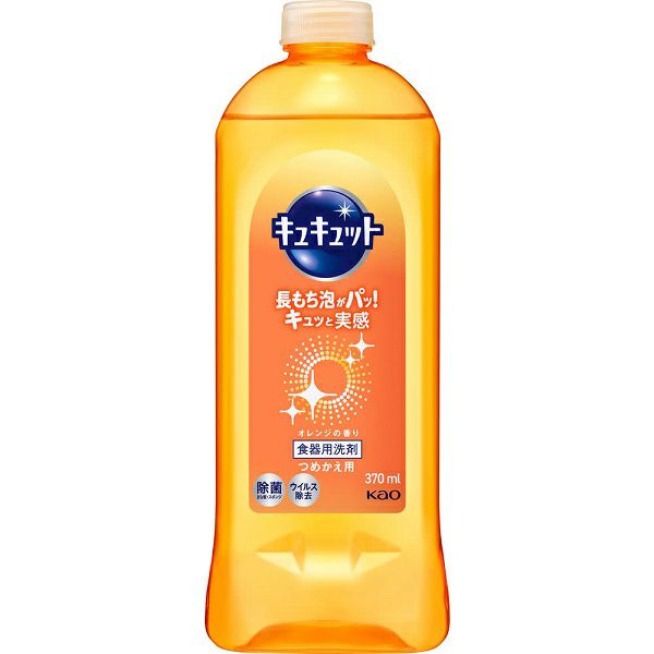 キュキュット独自のハイブリッド・ウォッシュ処方で、泡が触れただけで、ベッタリ油汚れを細かく分解!長もち泡がすすいだ瞬間、一気にパッ!汚れ落ちを指先と音でキュッと実感してください。 スポンジ・まな板の除菌、まな板・食器・調理用具のウイルス除去ができます(全ての菌・ウイルスを除去するわけではありません。 エンベロープタイプのウイルス1種で効果を検証)。 手にやさしい。 オレンジの香り。