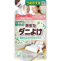 【成分】 植物由来成分(ダニよけ成分)、孟宗竹抽出物(除菌成分)、緑茶エキス(消臭成分)、ハウスダスト除去成分、エタノール、香料 用法及び用量 【ボトルのつめかえ方】 (1)袋を切る ●袋上部の切り口を矢印の方向へ切り取ってください。※袋を強く持って切ると内容液が飛び出ることがありますのでご注意ください。 (2)ボトルに注ぐ ●片手で袋の中央あたりを持ち、もう片方の手でボトルをささえます。 ●そそぎ口からボトルに全量をゆっくり注ぎ入れてください。 ※他の製品と混ざらないようにしてください。 ※必ず「ピレパラアース防虫力ダニよけスプレー」のボトルにつめかえてください。 ※内容液がこぼれないようにご注意ください。万一こぼれた場合はすぐに拭き取ってください。 【ピレパラアース防虫力ダニよけスプレーの使用方法】 (1)先端口のキャップをまわして、「出」にする。 (2)20cmから30cm離して、十分に濡れる程度スプレーする。(50cm四方あたり1回から2回がダニよけの目安)衣類にスプレーする場合は、収納前に使用する。また、着用したまま使用しない。 (3)スプレー後は十分に乾燥させる。 (4)使用後は先端口のキャップをまわして、「止」にして保管する。 【使用場所の例】 衣類、ベビーベッド、ふとん・ベッド・まくら、カーペット・タタミ、布製ソファ・クッション、ぬいぐるみ 【標準使用量】50cm四方あたり1回から2回 【有効期間】ダニよけ効果は処理後約1ヵ月間(環境によって効果・持続は異なります) 剤型・形状 スプレー・詰め替え用