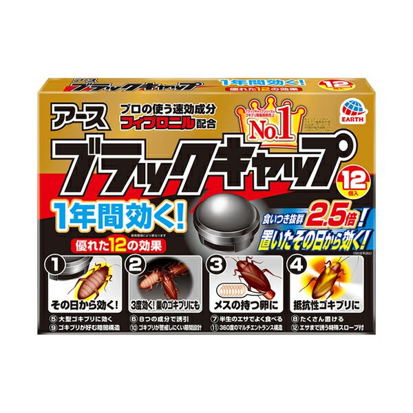 ブラックキャップ7つの効果!1)その日から効く!置いたその日から効果が現れる速効成分フィプロニルを配合。餌を食べたゴキブリを速効退治。2)メスの持つ卵に効く!餌を食べたチャバネゴキブリが持つ卵にも効く。※抱卵初期のメスに対しての効果ゴキブリの卵から成虫までトータルに効きめを発揮。3)薬剤抵抗性ゴキブリに効く!薬剤に対し抵抗力を持ったしぶといゴキブリにもしっかり効く。もちろん、大型ゴキブリも速効退治。どんなゴキブリにも効く。4)巣に潜むゴキブリに効く!餌を食べたゴキブリはもちろん、そのゴキブリのフンや死骸を食べたゴキブリも駆除。巣の中の幼虫や他の成虫もすばやく巣ごと退治。5、6、7)優れた効きめを発揮するブラックキャップ容器!ブラックドームの暗闇と、適度な隙間でゴキブリが警戒しにくい。マルチエントランス容器が360度どこからでもゴキブリを誘い込む。たくさん置くことでゴキブリの駆除効果がアップ。
