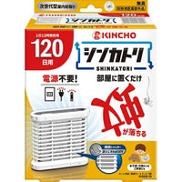 部屋に置くだけ蚊が落ちる。次世代型屋内蚊とり「シンカトリ SHINKATORI」。無臭。1日12時間使用120 日用。電源も電池も不要。灯油不使用。オン・オフは片手で容器を上下逆さまにするだけの簡単操作。リサイクル(PET→カートリッジ)。防除用医薬部外品。 <電源不要でどこにでも置ける> ・火気に対する心配がなく.置いたままでも安心。 ・お子様.犬.猫のいるご家庭でも使えます。玄関.寝室.子供部屋。