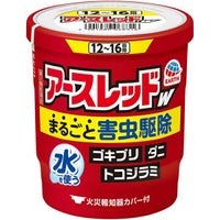 成分用法及び用量 ※ご使用に際して、添付の説明文書を必ずお読みください。また、必要な時に読めるように大切に保存してください。 【使用量】各害虫の駆除には次の使用量をお守りください。 ●ゴキブリ・屋内塵性ダニ類・イエダニ・ノミ・トコジラミ(ナンキンムシ)の駆除:12畳から16畳(20から26平方メートル)あたりに1缶 ●ハエ成虫・蚊成虫の駆除: 24畳から48畳(40から80平方メートル)あたりに1缶 【使用方法】 (1)使用前に準備すること (1-1)部屋を閉め切り、戸棚、引き出し、押し入れなど害虫のかくれ場所になる所を開放してください。食器棚の食器は新聞紙などで覆ってください。 (1-2)寝具、衣類、飲食物、子供のおもちゃ、飼料、美術品、仏壇仏具などは、ポリ袋に入れるか、新聞紙などで覆うなどしてください。 (1-3)パソコン、テレビなど精密機器にはカバーをかけ、ディスクなどは箱に収納してください。 (1-4)ペットや植物、観賞魚などは、換気と掃除が終わるまで部屋の外に出してください。 (1-5)火災報知器は添付の専用カバーまたはポリ袋などで隙間が出来ぬよう覆いをしてください。※使用後は必ず元に戻してください。 【注意】大型コンピュータの設置されている部屋では使用しないでください。移動できない水槽は、エアーポンプを止めて、ビニールで覆いをし、ガムテープで止めるなどして、完全密閉してください。 (2)アースレッドWを使用する (2-1)プラスチック容器の中のアルミ袋を取り出し、水をプラスチック容器の点線まで入れてください。(水の量約28mL) ※点線以上に多く入れ過ぎないように注意してください。(蒸散不良の原因になります。) (2-2)アルミ袋を開け、缶をそのまま取り出してください。 ※使用直前に開封してください。(開封した状態で長時間放置すると、空気中の水分で少しずつ反応が進み、蒸散不良となります。) 2-1のプラスチック容器を部屋の中央に置き、赤いシール面を上にして缶を水につけ、リング状の蓋をしてください。(約1分で蒸散がはじまります。)【注意】セット後は缶が熱くなるので、触れないでください。
