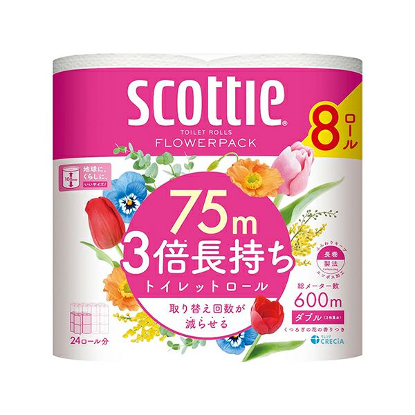 ●8ロールで24ロール分の長さ。(1ロールの長さが3倍:当社比)●たっぷり使えて取り替えの手間が減り、収納もコンパクト。●クレシア独自のふっくらエンボス加工で、やわらかくコンパクトな長尺ロール。●家庭用トイレホルダー適応サイズ。●くつろぐ花の香りつき。