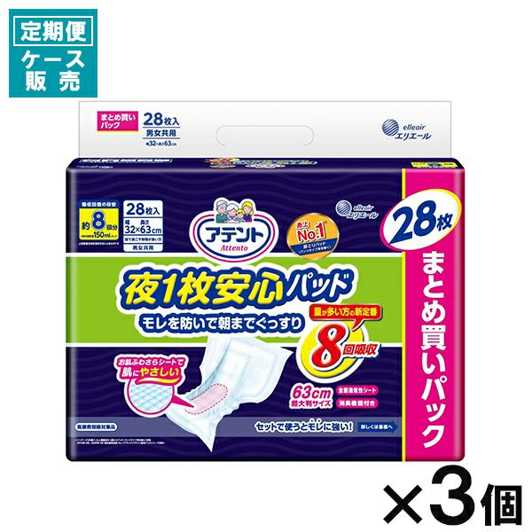 【定期便】【ケース販売_3入り】アテント 夜1枚安心パッド8回吸収28枚【大容量】