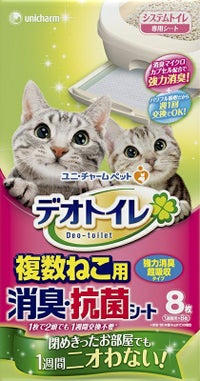 ユニ・チャームペット「デオトイレ複数ねこ用シート」は、1枚で2頭でも約1週間交換不要の猫用システムトイレ取替シートです。