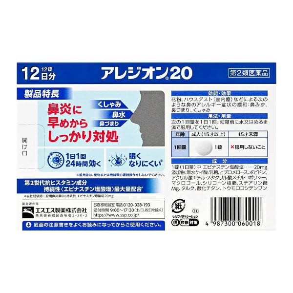 他の画像を見る 【第2類医薬品】エスエス製薬 アレジオン 20 12錠入り×1箱 【セルフメディケーション税制対象商品】 セルフメディケーション税制対象 本体価格 ¥ 2,189 税込 カートに入れる お気に入りに登録する